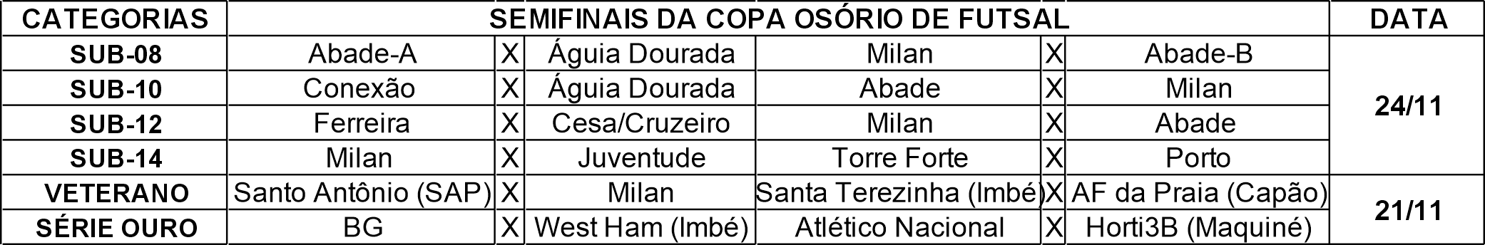 Copa Osório de Futsal conhece semifinalistas da Série Ouro, Veterano e categorias de Base